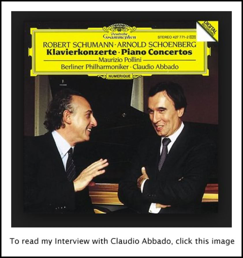 Dit interview vond plaats tijdens een van mijn beroemde "Half Concerts". Natuurlijk geniet ik elk seizoen van veel symfonieën en opera's, maar als de omstandigheden dat dicteren en de tijd het toelaat, woon ik de eerste helft van het optreden bij (wat het concert zou omvatten), en ga dan tijdens de pauze backstage en voer het interview met de solist tijdens de tweede helft. Dat was het geval toen ik Pollini ontmoette in oktober 1997. Hij was in Chicago voor het Schumann Concerto met het CSO onder leiding van Daniel Barenboim, en stemde ermee in me slechts een paar minuten te geven in zijn kleedkamer na zijn optreden. [Zie mijn Interviews met Daniel Barenboim.] Opgetogen en enthousiast over wat zojuist op het podium in Orchestra Hall had plaatsgevonden, reageerde hij op mijn vragen met oprechte belangstelling en overwoog zorgvuldig zijn ideeën in plaats van zomaar een afgezaagde reactie te geven. Hoewel zijn Engels erg goed was en we geen vertaler nodig hadden, waren zijn zinswendingen en woordkeuze zowel charmant als prikkelend. Om deze reden heb ik enkele van de grammaticale onvolkomenheden in de tekst achtergelaten. Als ik het nu lees, kan ik zijn stem in mijn gedachten horen, en de humor en wijsheid zijn duidelijk in zijn formulering. Misschien is het de artistieke vrijheid die doorklinkt in de woorden, maar ze drukken wel de spontaniteit en enthousiasme uit die altijd aanwezig zijn in zijn pianoprestaties.